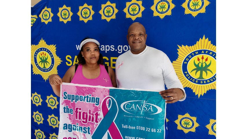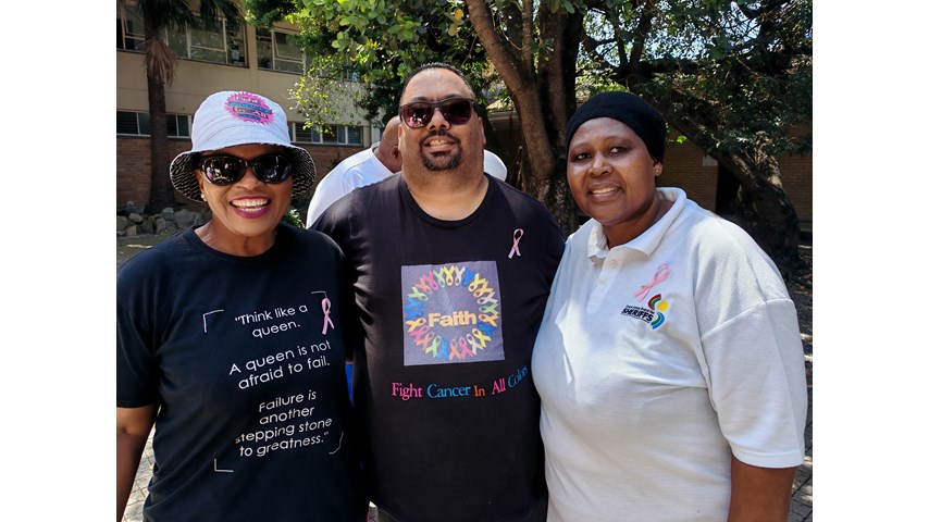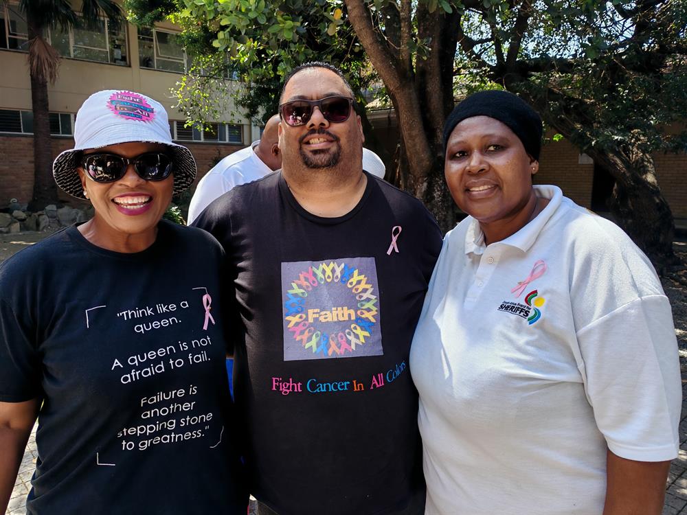 Supporters from the Child Protection, Family Violence and Sexual Offences Unit: Captain Zoleka Somathamba and Sergeant Brendon Jacobs with SAPS member and cancer survivor Captain Nontombi Hewu.