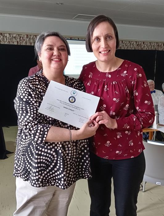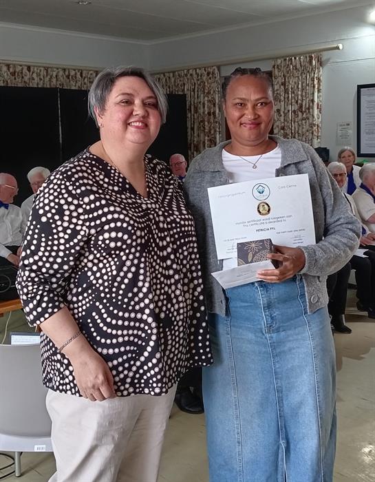 Ninke Stanley (regs) ontvang 'n sertifikaat vir 5 jaar diens van Alani Voigt, TuiniDqua se hoof.