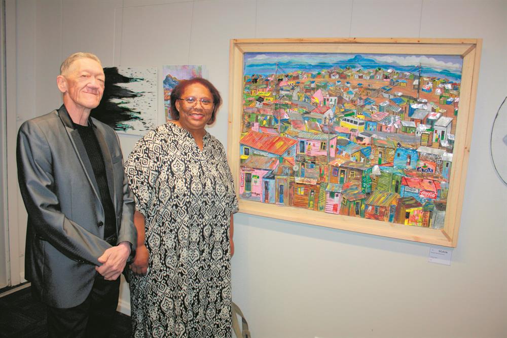 A number of works by the Pacaltsdorp artist, Timothy Pangle, are on exhibition. Here he is with Rachel Williams, manager of the George municipal libraries, at his George Township Scene.
