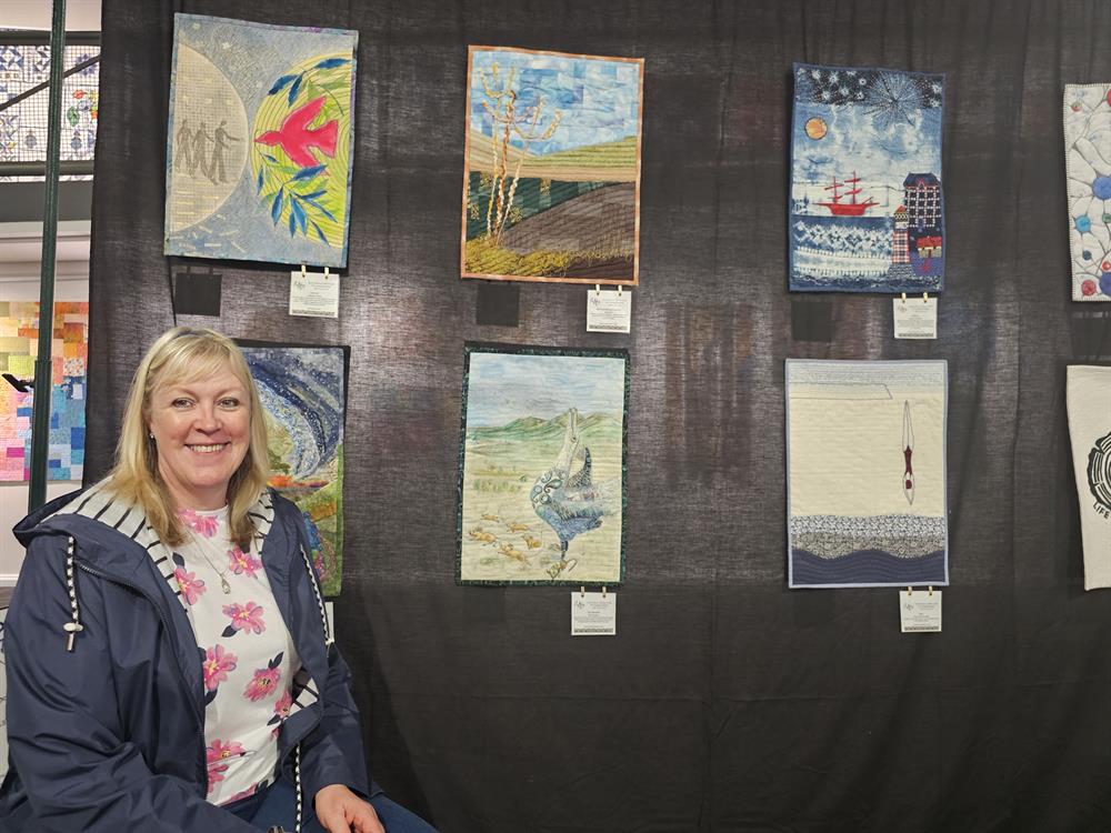President van die Suid-Afrikaanse Kwiltersgilde, Antoinette Kriel, by van die kwilts wat deel vorm van die reisende uitstalling.