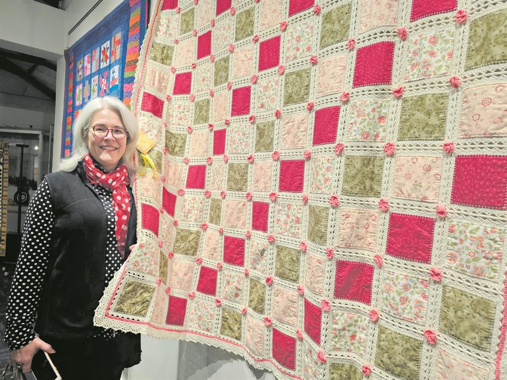 Marian Viljoen by 'n kwiltdeken wat sy vir haar skoonma gemaak het en wat deur die beoordelaar Odett Tolksdorf as een van twee beoordelaarskeuses op skou aangewys is.