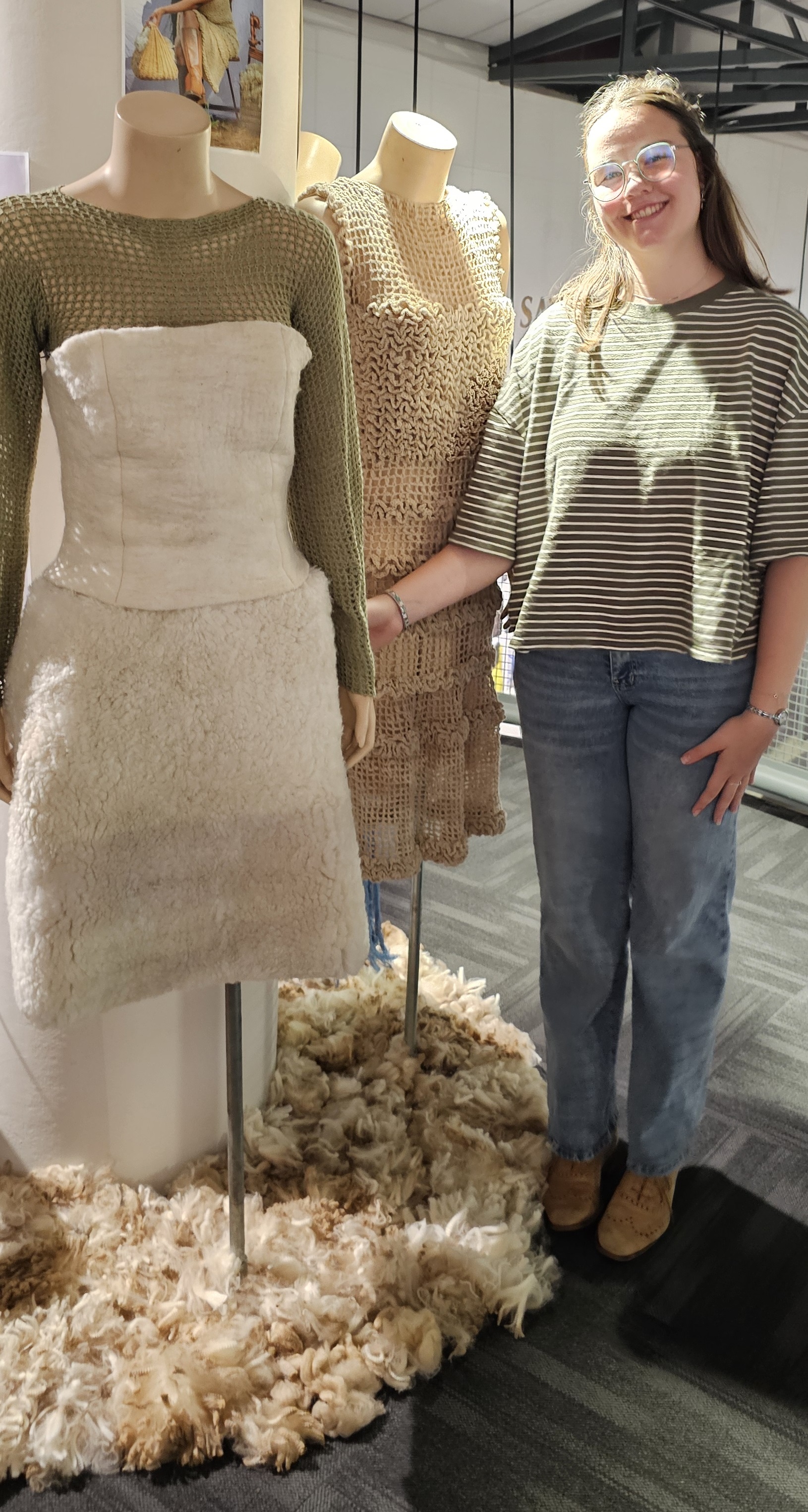 Thalitha Potgieter with some of her 100% wool designs. The miniskirt is from sheepskin and the top from felt fabric that she made herself. She crocheted the dress from wool she spun herself.