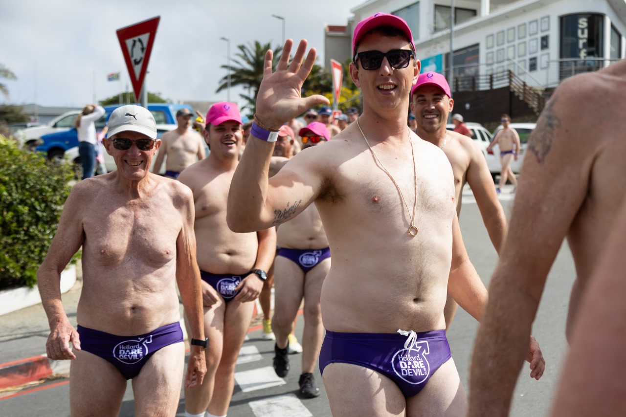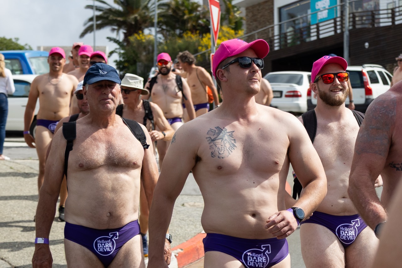 On Friday 31 October, guys of all ages, shapes and sizes took to South Africa’s streets sporting only purple Daredevil Speedos to raise awareness about prostate and testicular cancer. The Garden Route was no exception as a group of scantily clad men strutted their stuff during the 16th Hollard Daredevil Run on Friday afternoon. The 5 km route took them from the Dolphin Circle in the centre of Plettenberg Bay to the finish line at the Surf Lifesavers Club on Central Beach. Here is a beautiful collection of photographs of the Plett daredevils in action.