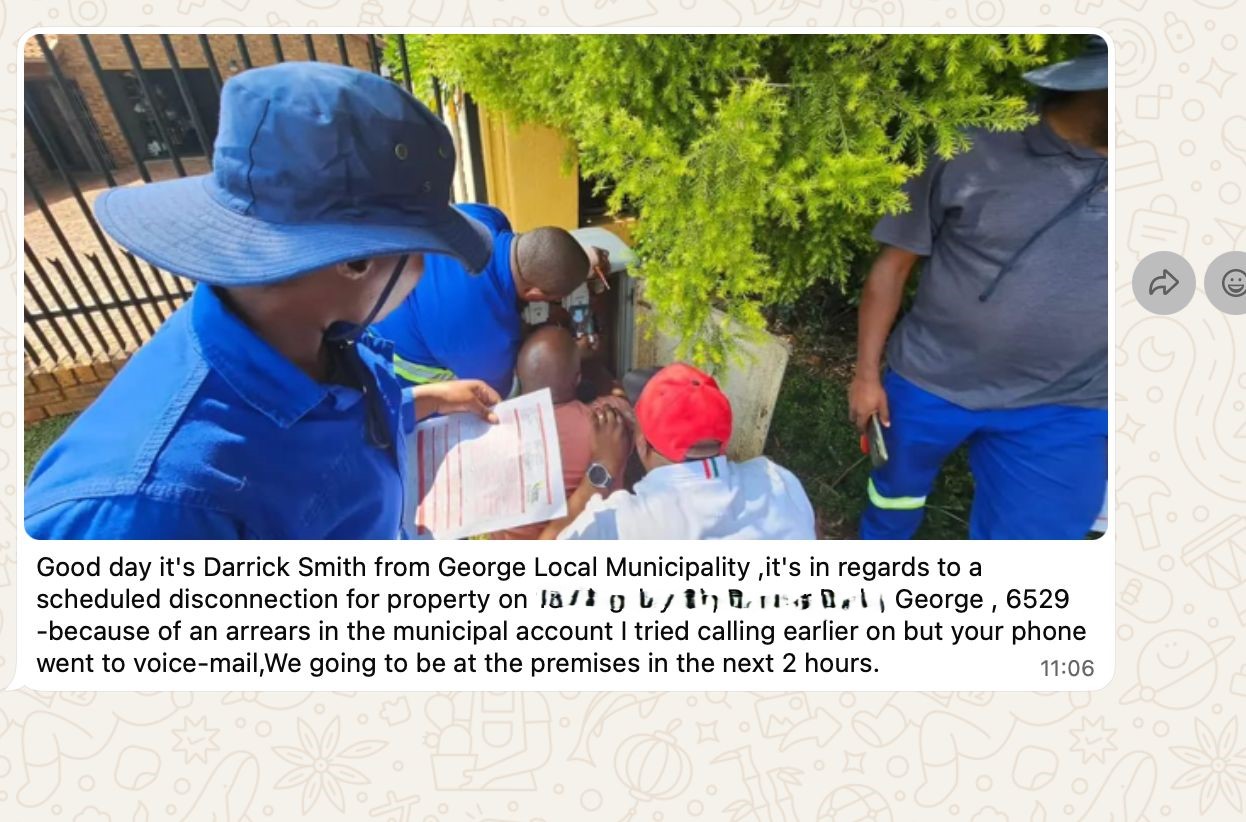 The scammer threatens residents with a so-called “scheduled disconnection” due to alleged arrears on their municipal account. In one message, the scammer says: “I tried calling earlier, but your phone went to voicemail. We’re going to be at the premises in the next two hours.”