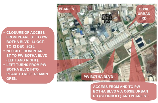 - Access from PW Botha Boulevard will be maintained via Ossie Urban Road (Steinhoff) and Pearl Street.