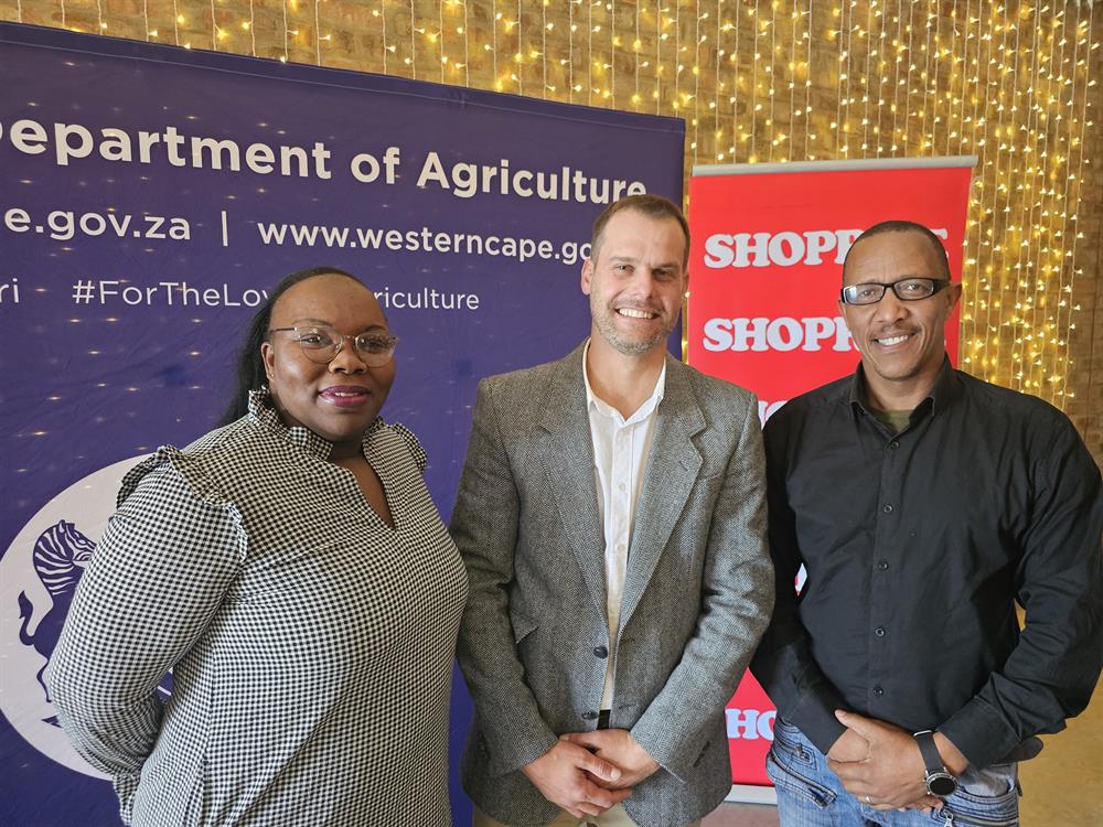 Dr. Jacques van Rooyen (middel), die gasspreker by Evon Mayekiso van die Wes-Kaapse departement van landbou, en die seremoniemeester, Peter Jaftha van Heartbeat FM.
