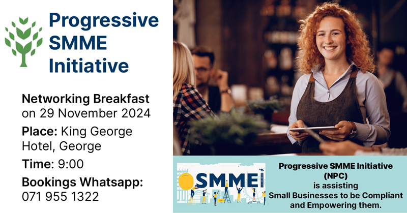 Our NPC called Progressive SMME Initiative are having a networking breakfast on the 29th November at the King George hotel in George.