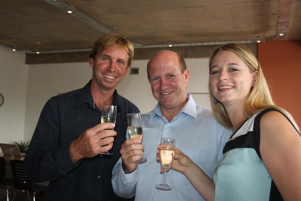 Cheers to their new offices! From the left Mr. Harvey Trent, marketing and business development manager, Mr. Dave Moss, national sales manager, and Ms. Debbie Tagg, chief operating officer, celebrate the opening of Commerce Edge's new offices.