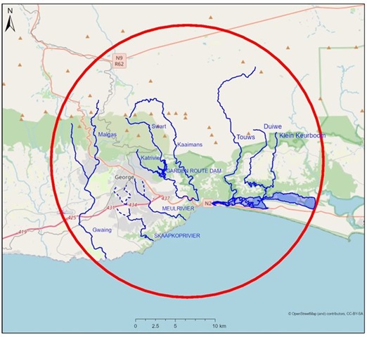 The Garden Route Dam Action Group's map of rivers that run through the George area. The Gwaiing, Schaapkop and Meulen Rivers are situated to the southwest.