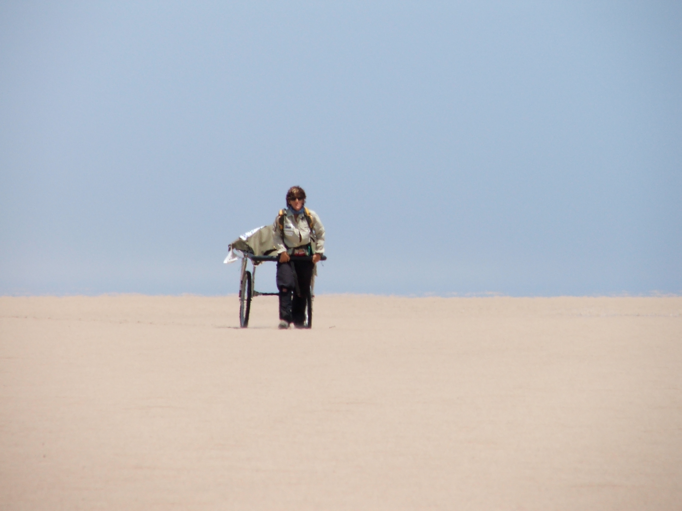 In 2005, at the age of 41, Grobler made history with her first unsupported solo adventure - a 330km walk along the Northern Namib Desert coastline in Angola, including the notorious Death Acre (Doodsakker) where frigid Atlantic Ocean waves, in the absence of a shoreline buffer, crash directly against the dune face, making it impossible to traverse on the high tide. Starting at the Kunene River mouth and ending at Moçâmedes, the project, dubbed Walk for Wheels, was undertaken to raise funds for landmine victims in Angola.