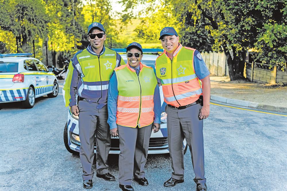 Plaaslike verkeersbeamptes het die motor-fietsryers begelei. Van links is Franklin Windwaai, Aviwe Matiwane en Duwayne Joseph.