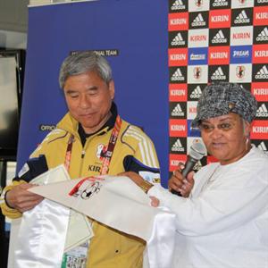 Mayor Mercia Draghoender presented 30 embroidered satin scarves to the head of the Japanese delegation, Kuniya Daini at the official hand over of the media centre to the Japanese.