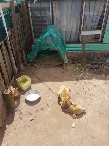 "The woman that called the SPCA said the extremely emaciated, chained pitbull lying on the ground belonged to her son who works in Cape Town and periodically comes to visit. She herself had been away for two months and when questioned, said that she asked no-one to feed the dog while she was away," said Jones.