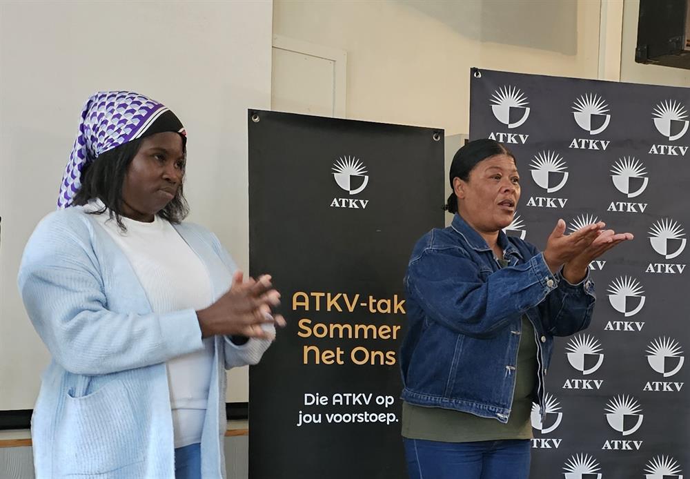 Nelisiwe Nzama (links) en Susan Munroe, albei van DeafSA, doen ’n inleidende demonstrasie van gebaretaal.