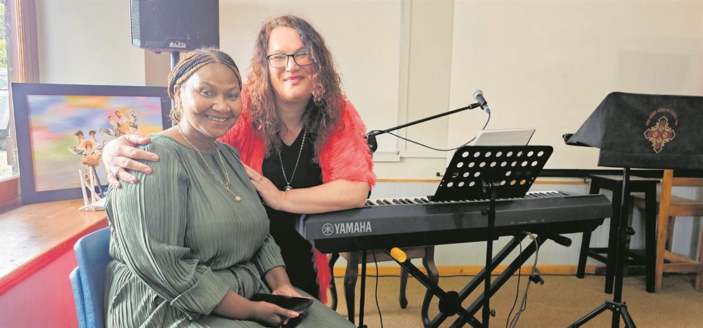 Ruzanne van Beulen en sanger Petronel Baard wat 'n gedig van Van Beulen getoonset het wat sy tydens Saterdag se program gesing het.