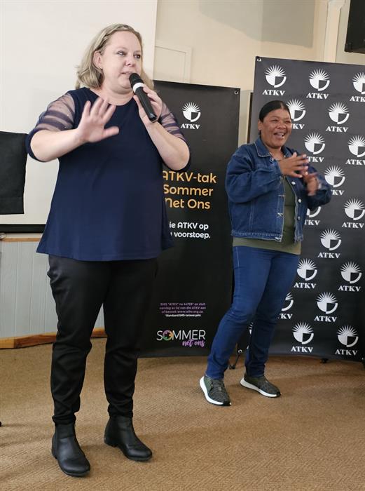 Gebaretaalonderwyser by Carpe Diem, Leana Jansen van Rensburg. In die agtergrond staan Susan Munroe van DeafSA.