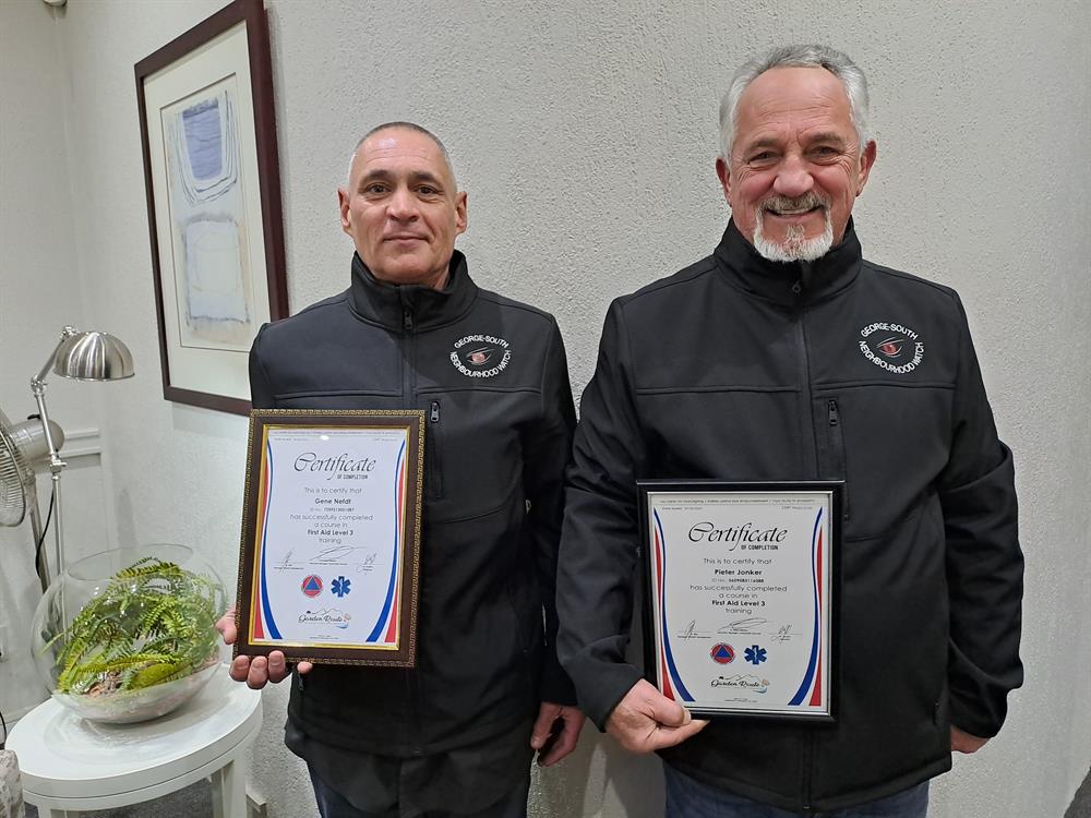 Gene Nefdt en Pieter Jonker, wat onlangs hulle vlak 3-noodhulpkursus voltooi het.
