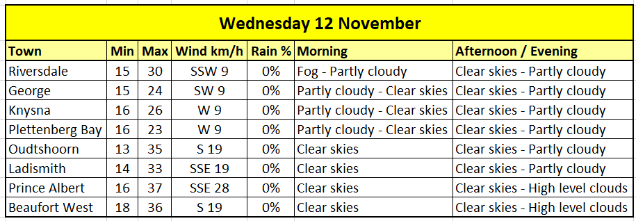 GARDEN ROUTE | KAROO NEWS - Very hot and uncomfortable conditions are expected over the interior of Namakwa in the Northern Cape, West Coast and Central Karoo districts, including Breede Valley and Oudtshoorn municipalities tomorrow, Wednesday 12 November.