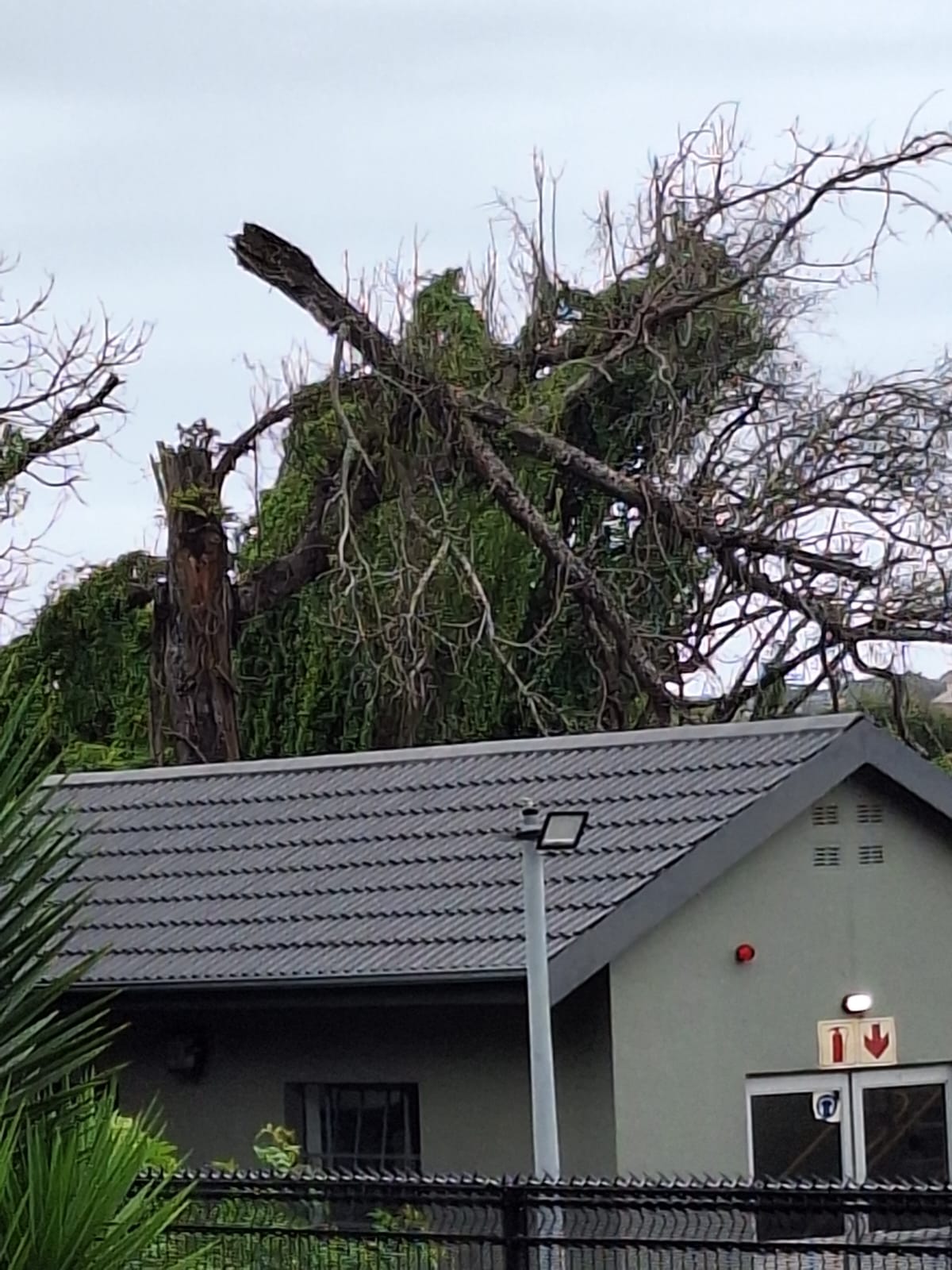 - Fallen tree on Wilderness Water Treatment Works building being assessed and removed