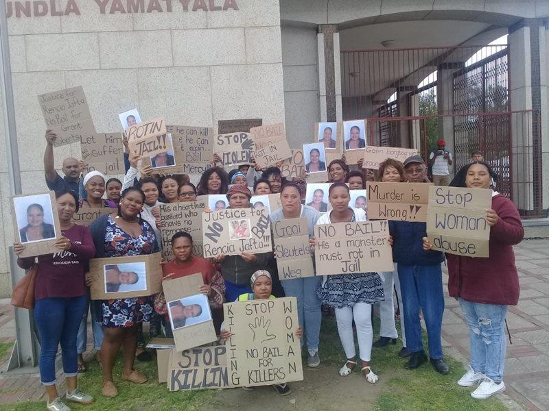 Gemeenskapslede wat tydens Robertson se borgtogaansoek voor die hof betoog het. Foto: Kristy Kolberg REGS: Vir haar ouers is Jafta, 'n oudleerder aan Hoërskool Parkdene, se dood steeds 'n geweldige skok.