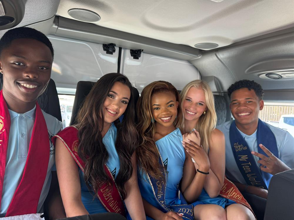 Suid-Afrika se ambassadeurs op pad na hul hotel vanaf die lughawe, voor die kompetisie: Joshua Jansen, Sharica Bondesio, Lesedi Molise, Liandri Lamprecht en Mhlengi Khuzwayo.
