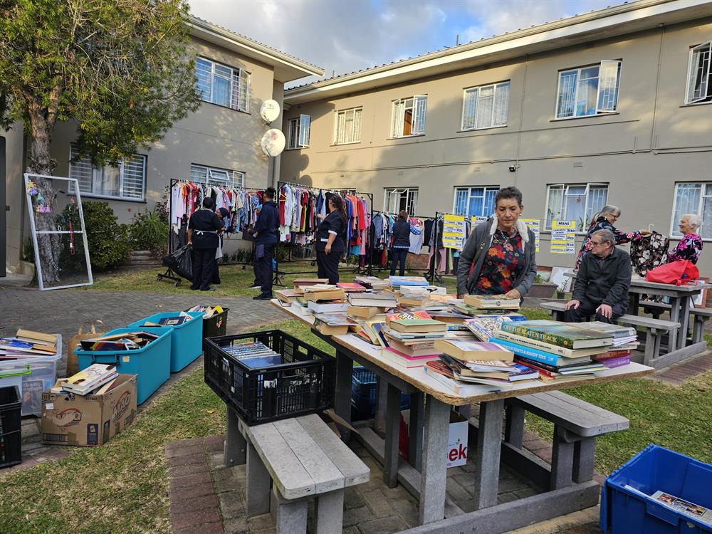 Besoekers kan snuffel vir winskopies onder ’n groot voorraad tweedehandse klere en boeke.