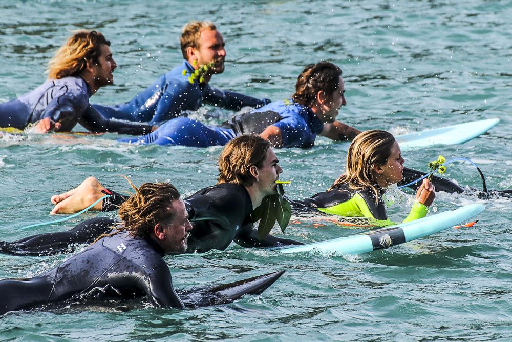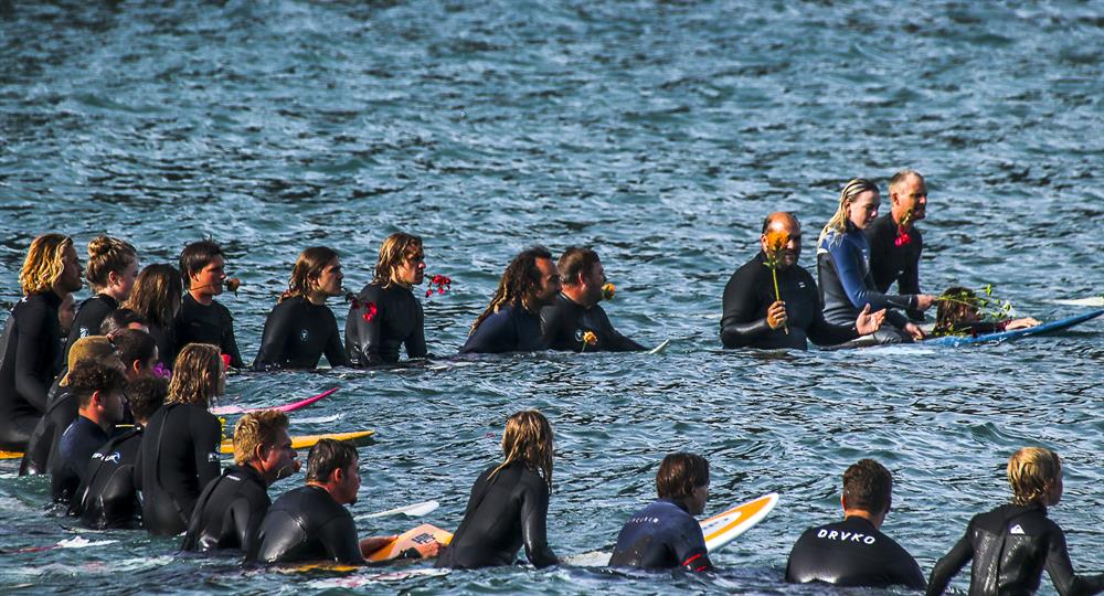 Fellow surfers paddling out for Michael in Victoria Bay.