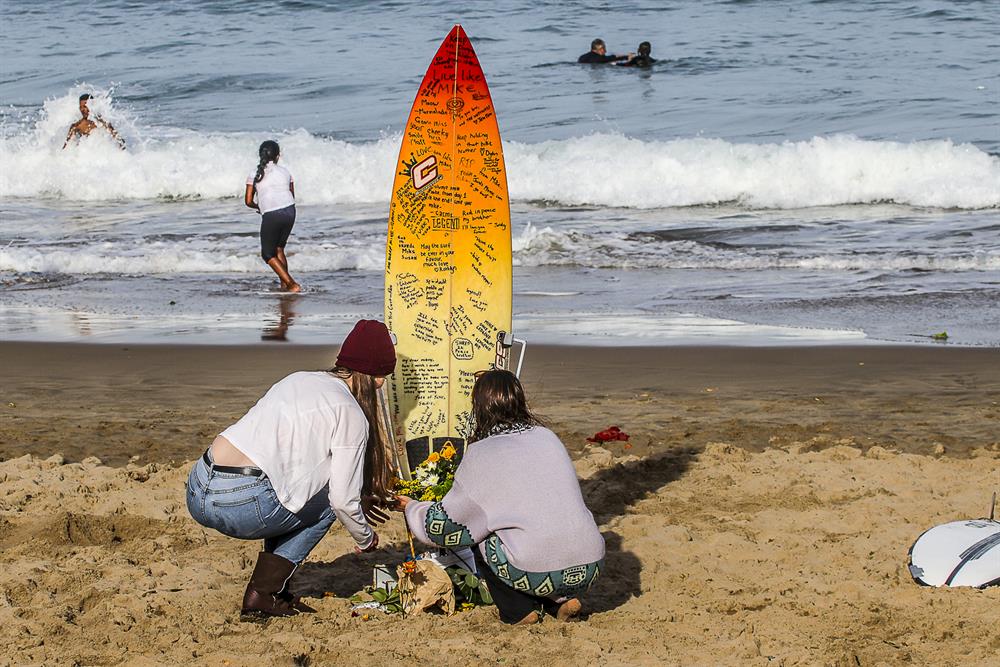 Local surfers paddled out with flowers in memory of their friend, Michael Roberts.