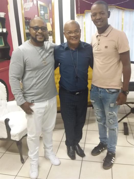 Eersko-mende Sondag kuier Noble saam met Morné Gallant (links) van Sedgefield. Regs is Noble se sleutelbord-speler, Jason Galant saam met hulle op die stel.