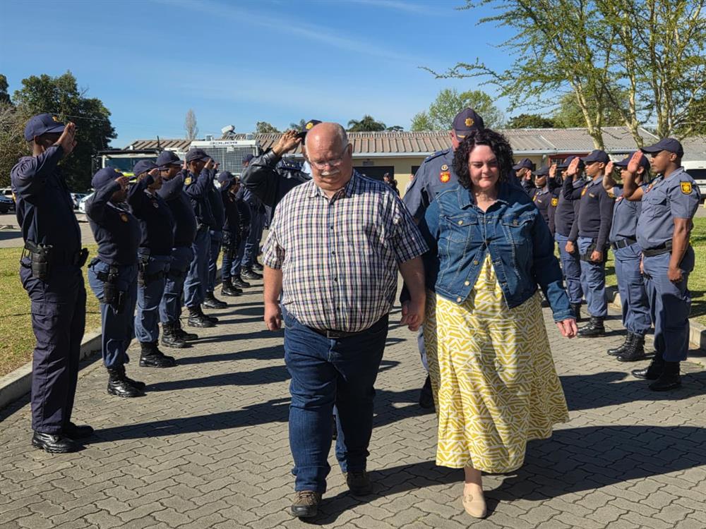 Accompanied by his wife, Jacomiena, and greeted by a full platoon and guard of honour, he was praised by the District Commissioner of the Garden Route, Major General PV Cetyana, for his almost 40 years of service.