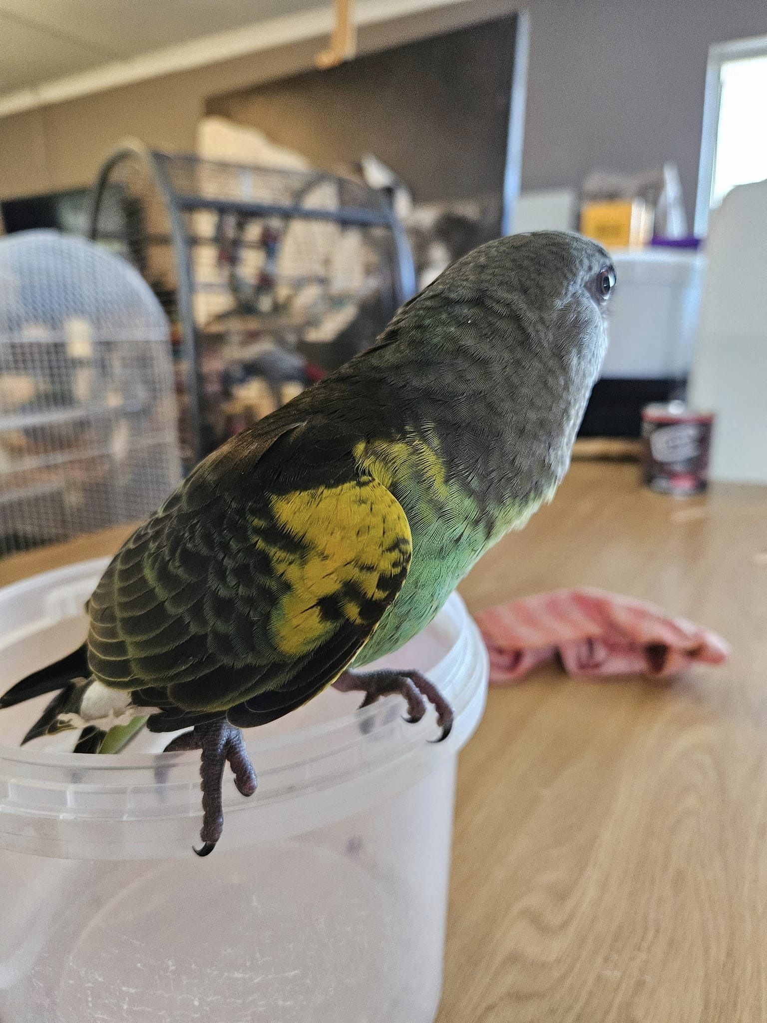 Please look around in your gardens for any sign of Knorrie. He is about the size of a cockatiel. He is grey and green with a little bit of yellow on his wing and blue on his back.