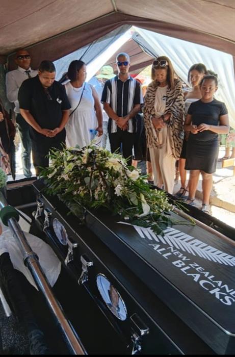 Die gedrapeerde 'All Blacks'-vlag oor die kis was die stille getuienis van Johannes 'Ouses' Milford se onwrikbare geloof in en liefde vir die Nieu-Seelandse rugbyspan.