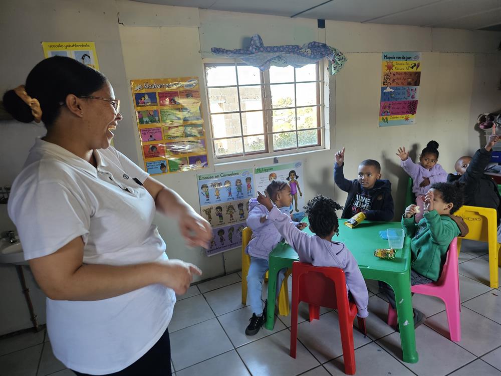Brunay Pieteren, a CHW of Bethesda, during a hand-washing demonstration to the little ones of Vlinders Kleuterskool. Part of the CHWs’ job is to do education in preventative health measures. Photos: Alida de Beer