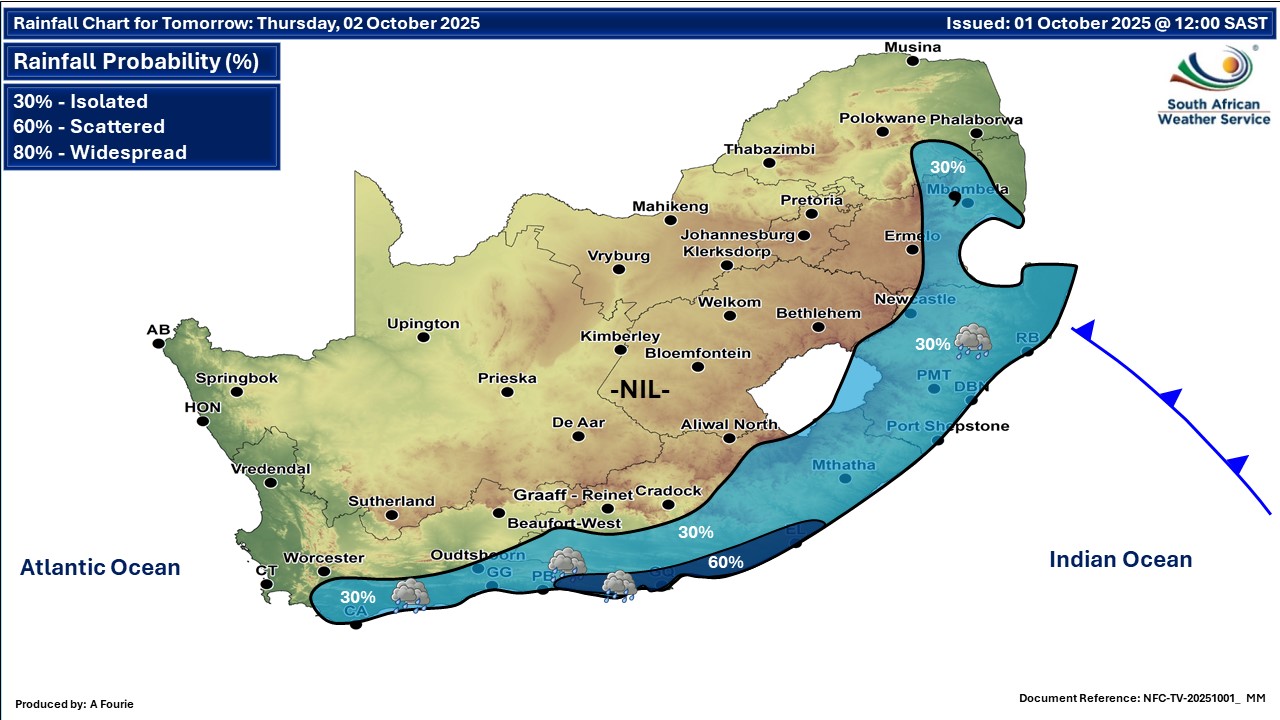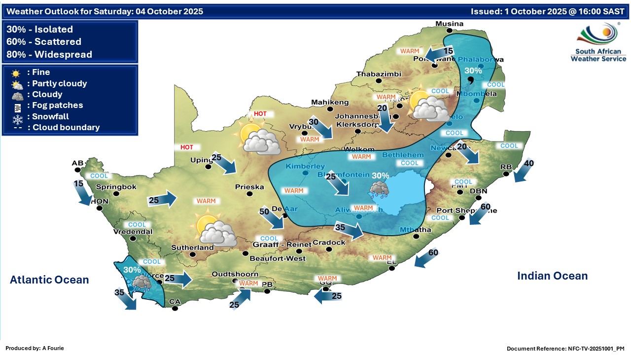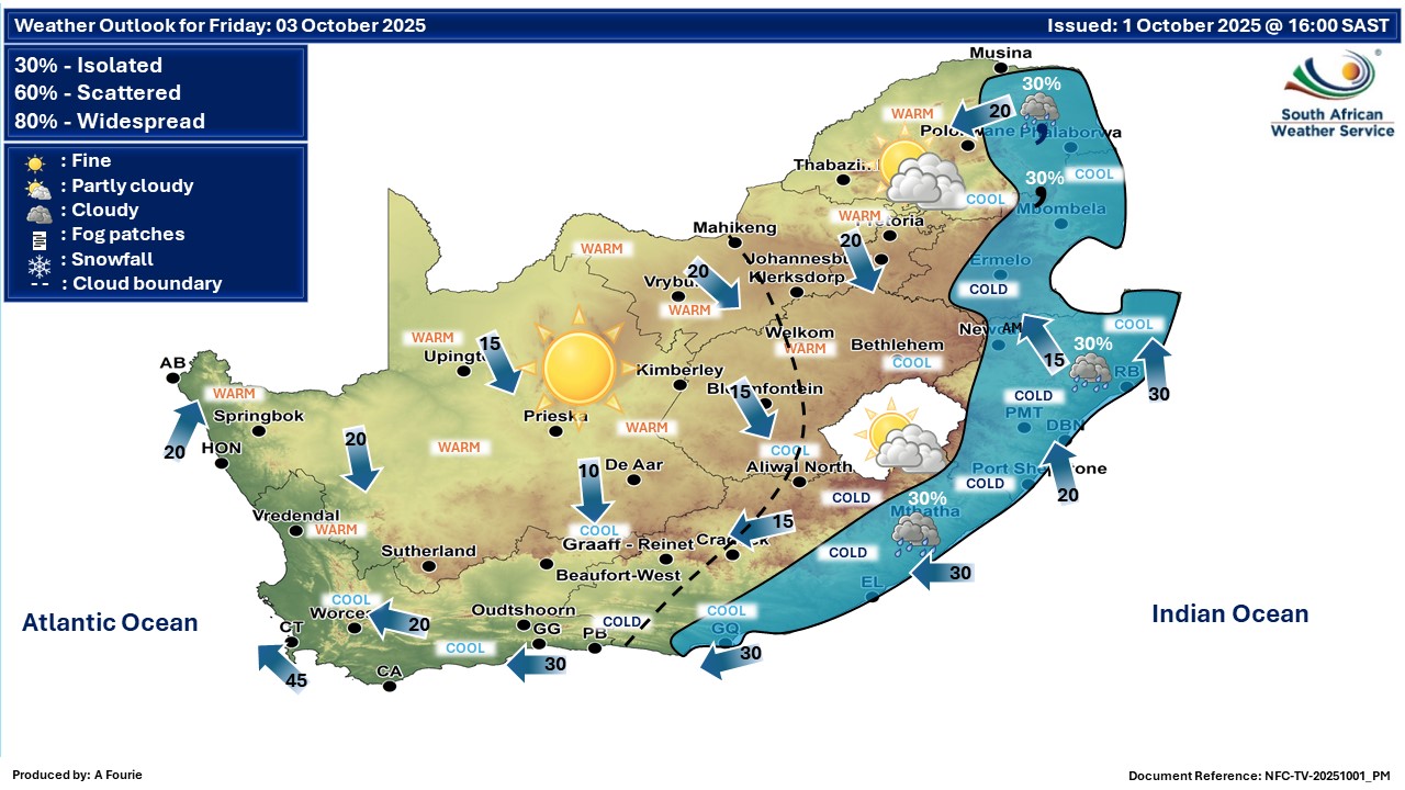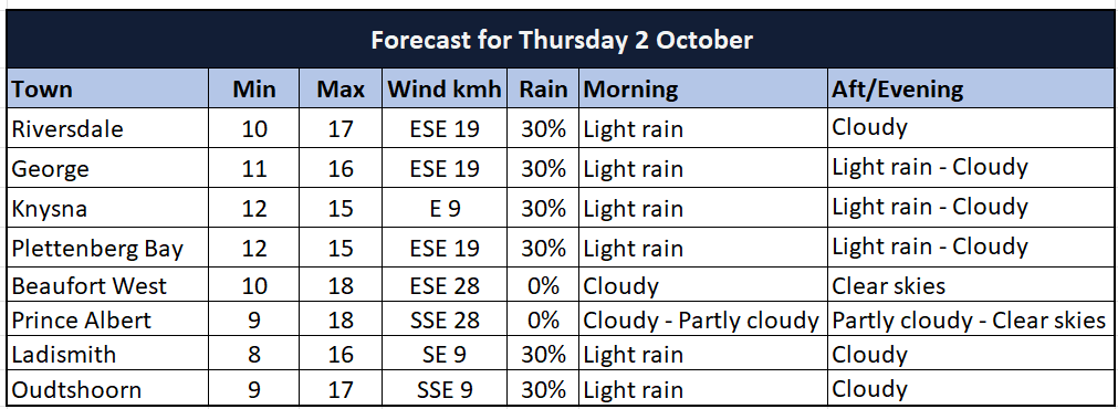 Cloudy and cold with isolated showers of rain south of the escarpment, but scattered along the extreme western parts of the coast. Snow can be expected on some isolated mountain peaks.
