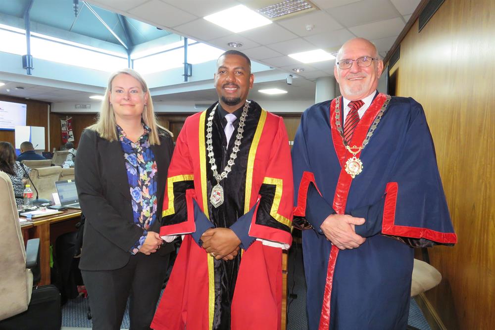 Mayor Browen Johnson is robed with the mayoral regalia by Municipal Manager Godfrey Louw and Speaker Sean Snyman.