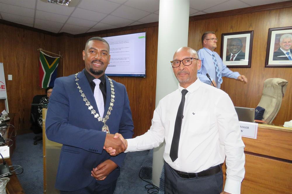 Taking the reins: The newly elected mayor, Browen Johnson, shakes hands with the municipal manager, Godfrey Louw, after the official announcement.