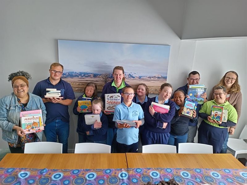 SCHOOLS NEWS - Roxanne Jewell and Joy Walker of Youth for Christ’s Options Care Centre with a group of learners of Up With Downs holding the books they chose.