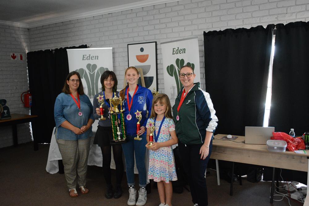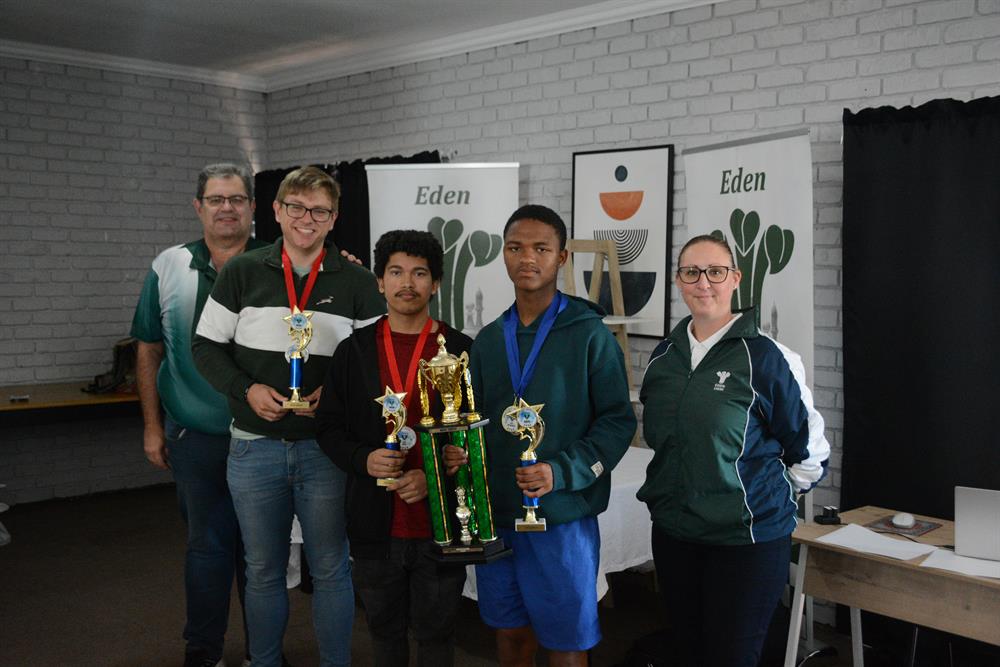 George Swart (Eden Chess Union's chairperson), George Swart Jr (2nd), Kyle Thoresen (3rd), the winner of the Eden Closed, Raynier Claassen, and Louise Cornforth (Eden Chess union secretary).