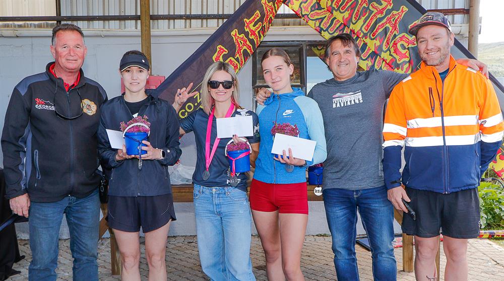 Neels Barnard (organiser), Danika Steyn (third), Hanlie Schamrel (runner-up), Karli Lotter (winner), Duppie du Preez (Outeniqua Harriers) and Deon de Jager (Outeniqua Harriers). Photo: Deidre Cloete