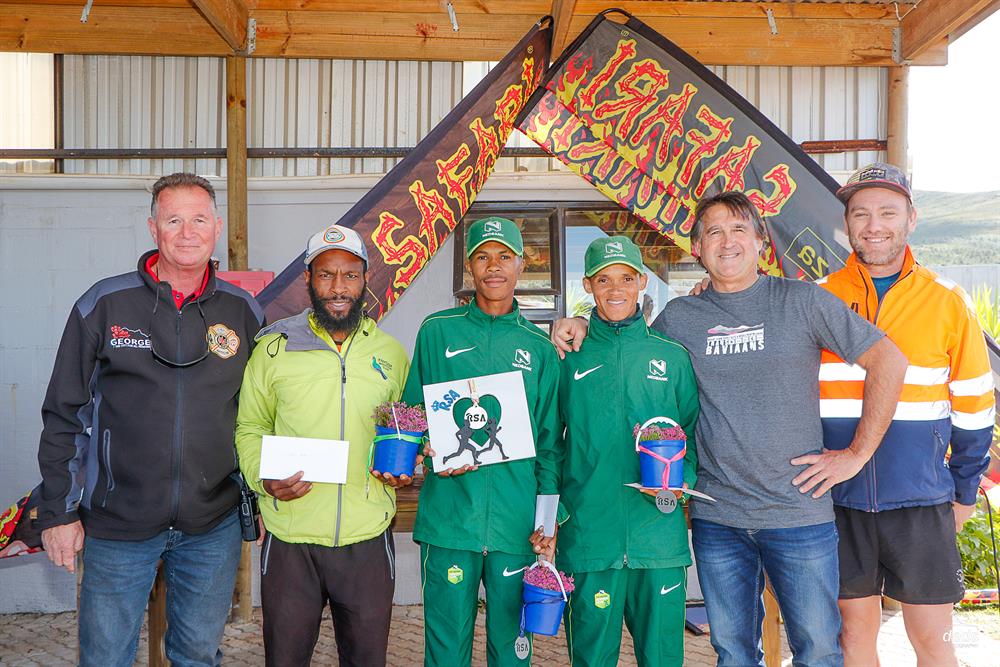Neels Barnard (organiser), Melikhay Msizi (third), Selwyn Matthews (winner), Francois Maquassa (runner-up), Duppie du Preez (Outeniqua Harriers) and Deon de Jager (Outeniqua Harriers). Photo: Deidre Cloete