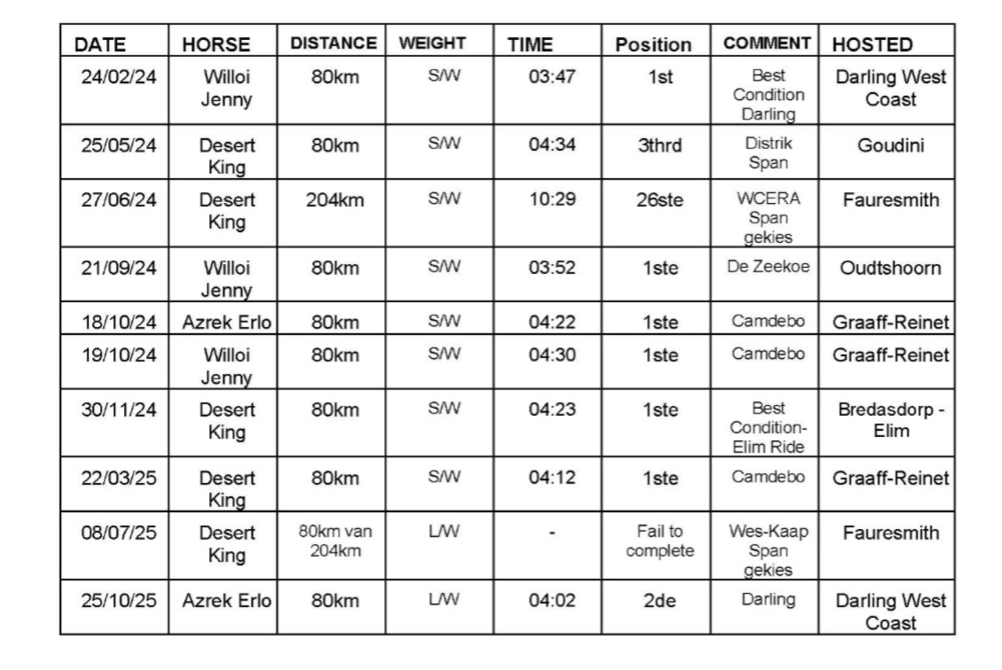 In Junie 2024 het sy en Desert King die uitmergelende Fauresmith-uithourit van 204km voltooi en honderde ander ervare ruiters met 'n 26ste plek getroef. Ongelukkig was daar vanjaar iets fout met Desert King se hoef en moes hulle na 80km uit die Fauresmith-uithourit ontrek.