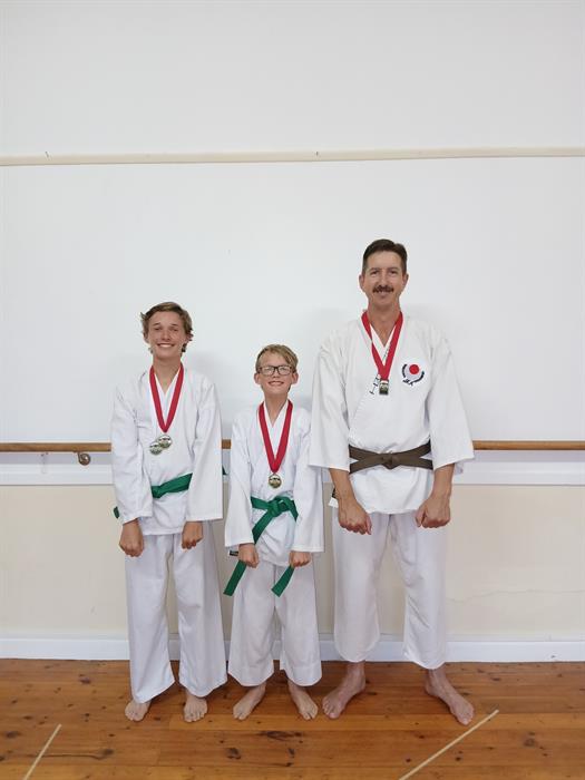 Jonathan-Daniël Bester (15, silver kata, gold kumite), Marnich Bester (13, gold kata, gold kumite) and Hendrik Bekker (49, participation medal).