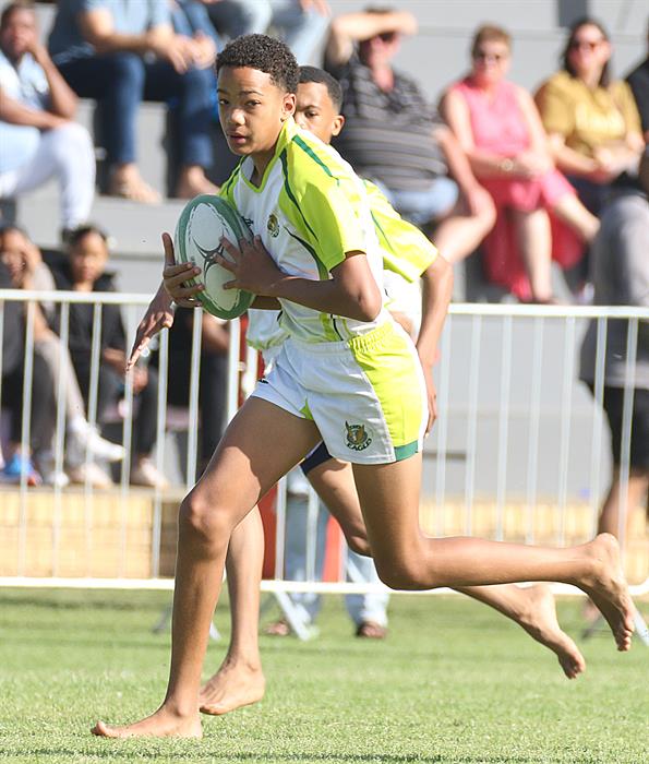 Nikoli Baadjies (Laerskool Outeniqua) breek weg met die bal. Die knaap het vaart én spoed.