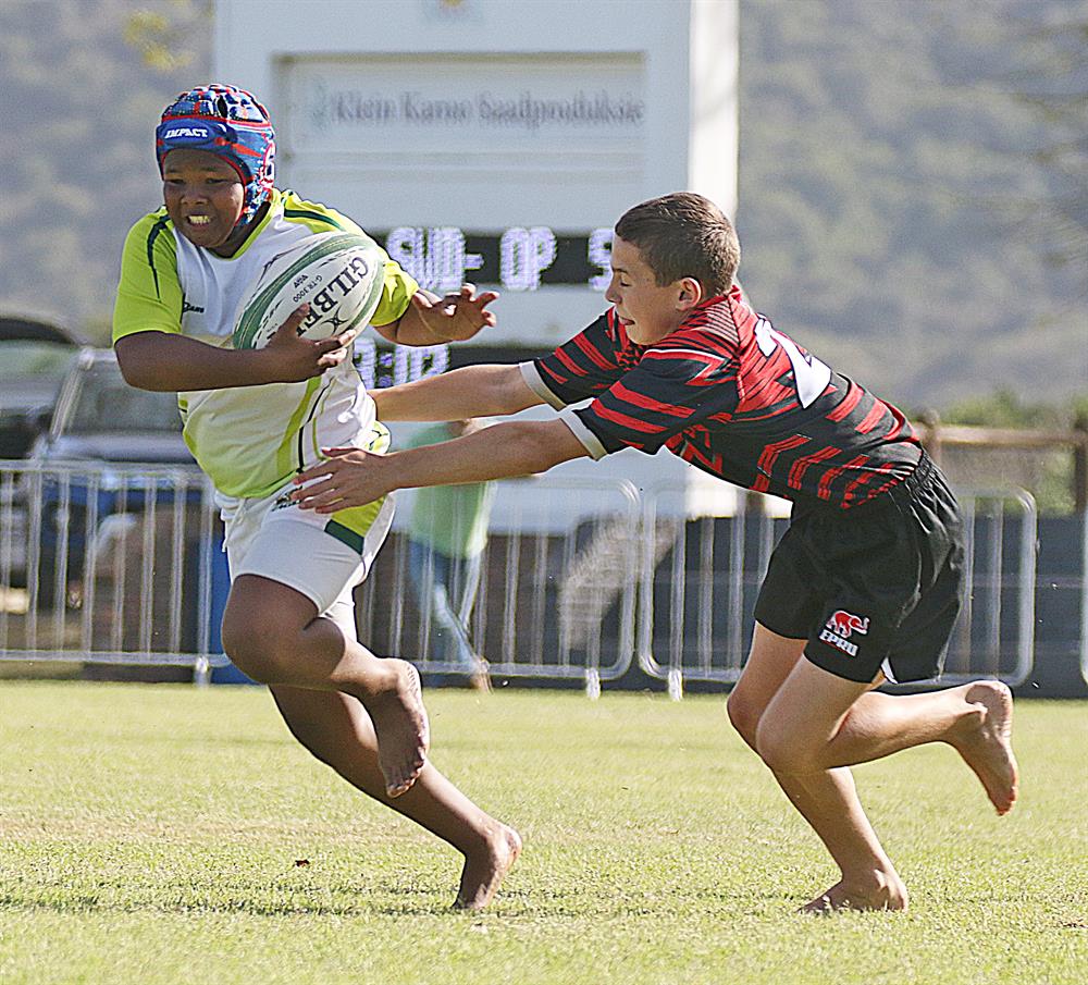 Alexander Helberg (Laerskool George-Suid) breek met gemak deur die Bolanders se verdediging op nog ’n kraglopie. Hou maar dié mannetjie dop. Hy gaan nóg groot rugby speel. Foto's: Hugo Redelinghuys