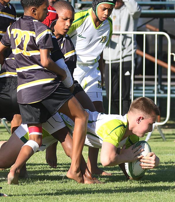 Alexander Helberg (Laerskool George-Suid) duik met brute krag oor vir ’n drie vir die SWD se A-span nadat hy die Boland se verdediging aan flarde geskeur het.